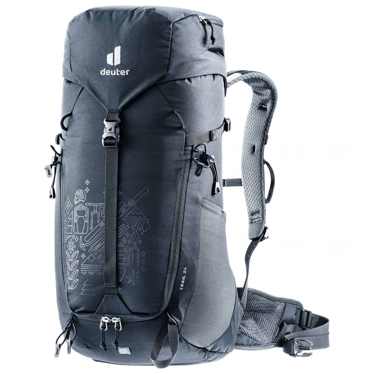 Wanderstöcke oder Eispickel lassen sich komfortabel außen am Tourenrucksack befestigen. Hüftflossen und der Brustgurt mit Pfeife lassen sich zum Klettern abnehmen. Die beiden elastischen Seitentaschen bieten Dir Platz für Trinkflaschen oder Ausrüstung. Seitliche Kompressionsriemen sowie ein Wertsachenfach im Inneren lassen keine Wünsche offen. Die abnehmbare Regenhülle, ein integriertes SOS-Label sowie das abnehmbare Deckelfach machen den Deuter Trail 24 zum idealen Partner am Berg.