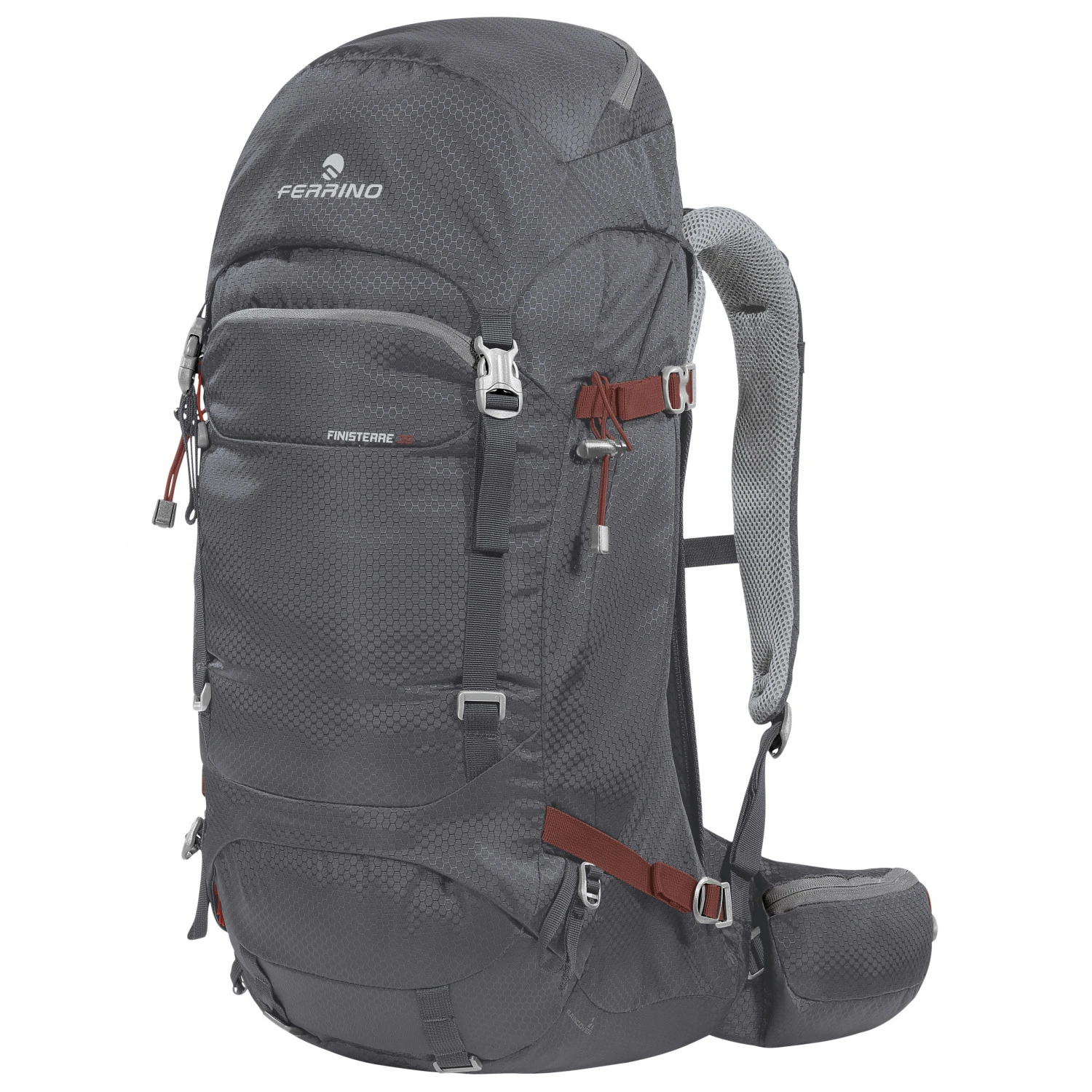 Der Backpack Finisterre 38 Trekkingrucksack von Ferrino eignet sich für ausgiebige Touren in den Bergen, bei denen der Tragekomfort nicht zu kurz kommen darf. Die gepolsterten Schulterträger sorgen in Kombination mit den weichen Hüftgurten für ein angenehmes Tragegefühl des Rucksacks. Damit auch schweißtreibende Bedingungen beim Besteigen von Gipfeln kein Problem sind und der Rucksack nicht unangenehm auf dem Rücken klebt, sind atmungsaktive Materialien und ein Netz-Rücken verarbeitet. Dieser dient als Abstandhalter, sodass zwischen Rücken und Rucksack eine angenehme Luftzirkulation stattfinden kann.