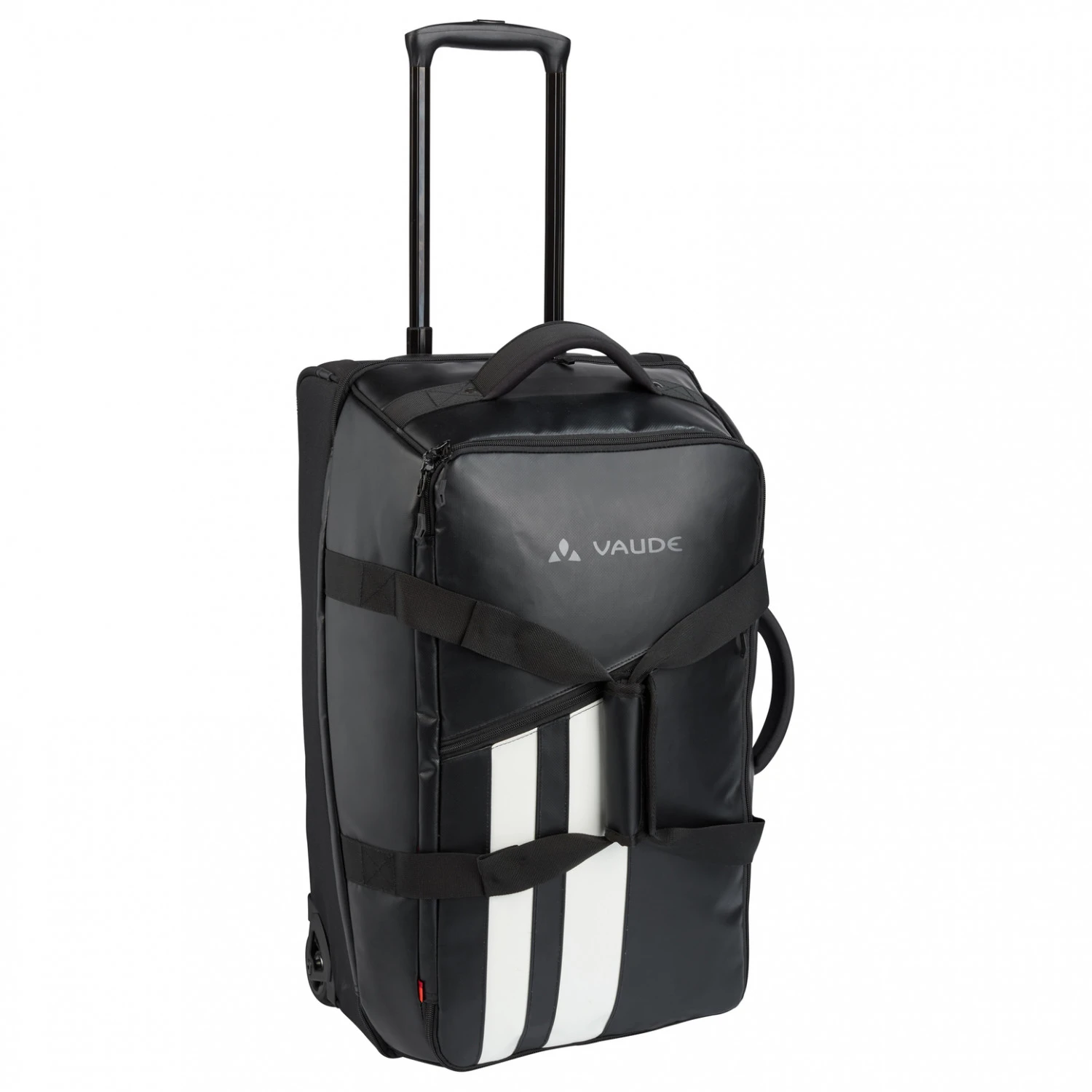 Die Reisetasche aus robustem und dank PFC-freier ECO Finish DWR wasserabweisendem Obermaterial kommt mit einem in der Mitte aufklappbaren Hauptfach mit 65 Litern Stauraum und Zwischenboden. Ein zusätzliches Zip-Fach für Kleinigkeiten ist an der Vorderseite verarbeitet. Das leichtgängige, austauschbare Rollensystem und der ausziehbare Teleskopgriff erlauben einen unkomplizierten Transport als Trolley-Koffer. Per Schultergurt und Tragegriff kann die Rotuma 65 aber auch als große Reisetasche verwendet werden.
